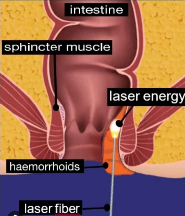 Grade III (Prolapsing, manual reduction needed) Laser hemorrhoidoplasty (LH) or laser surgery | 1470 nm diode laser probe inserted via stab incision to coagulate tissue between hemorrhoid and anal sphincter. Ideal for multiple/recurrent cases; less pain than EH.